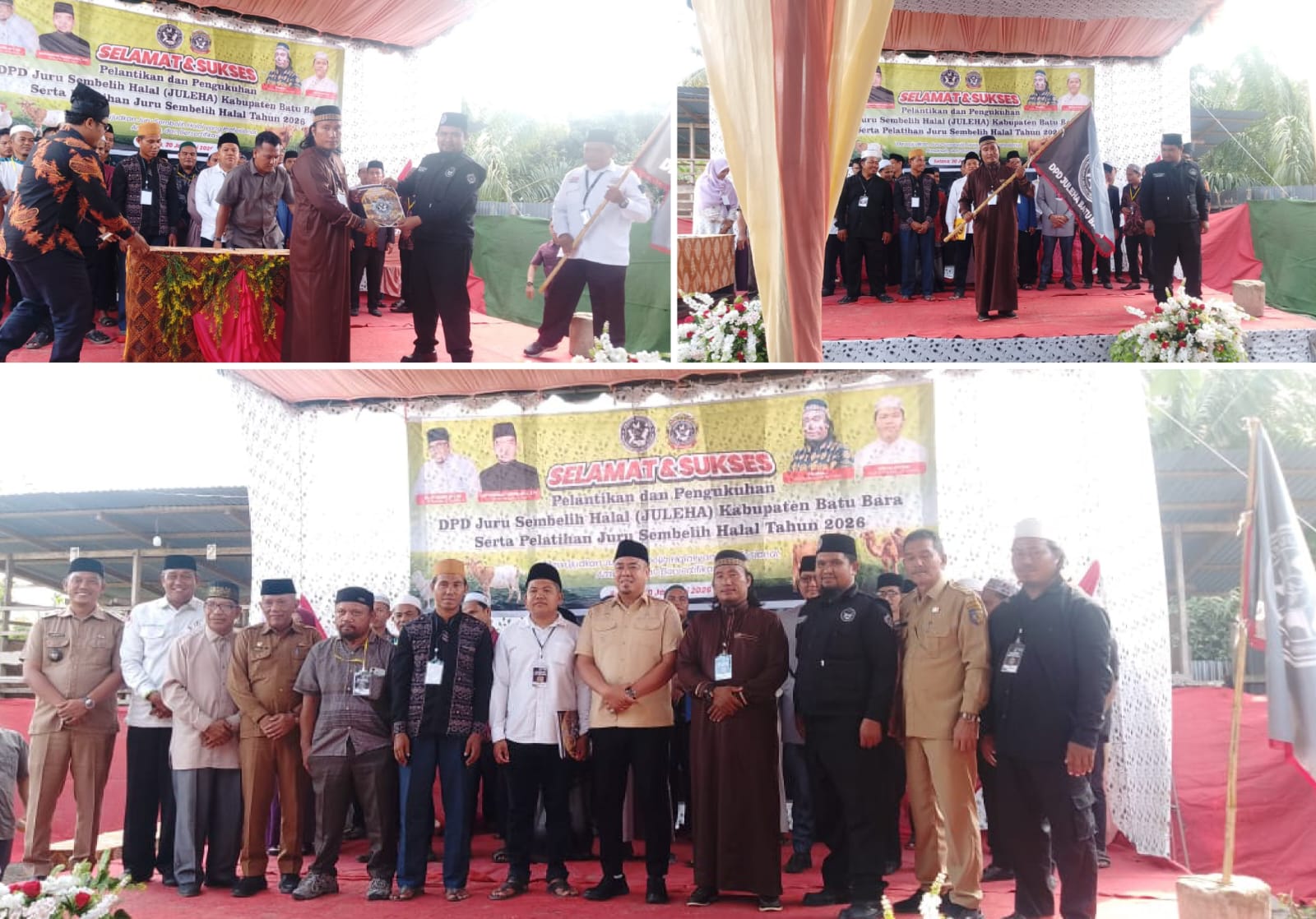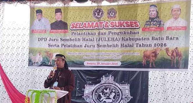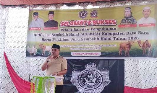 Batu Bara // busertipikor.com Prosesi pelantikan DPD JULEHA (Juru Sembelih Halal) Kabupaten Batu Bara dilaksanakan oleh pengurus DPW JULEHA propinsi Sumatera Utara serta penyerahan SK DPD sekaligus bendera petaka organisasi di simpang sianam desa dahari indah, kecamatan Talawi, kabupaten batu bara,Selasa (20/01/2026.