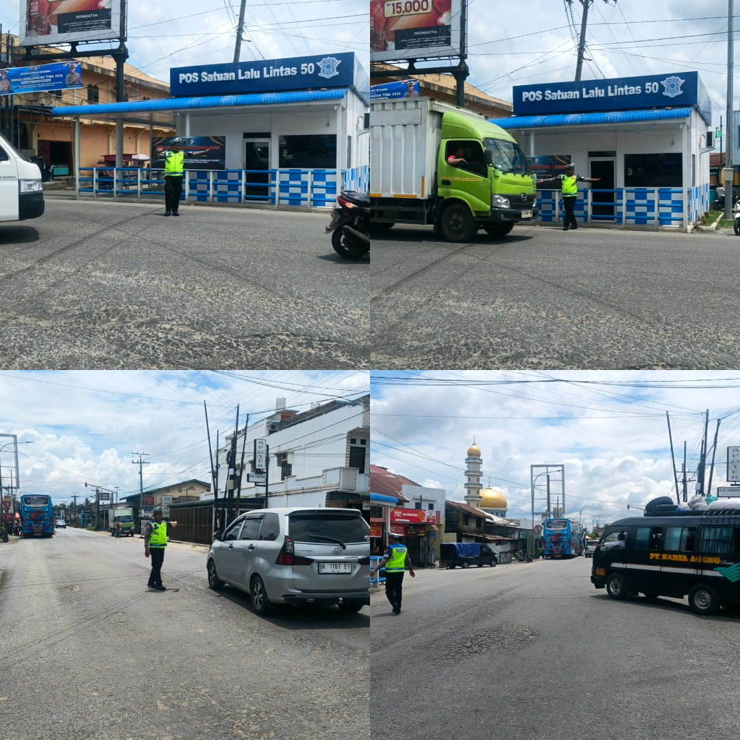 Personel Sat Lantas Polres Batu Bara kembali melaksanakan pengaturan lalu lintas (gatur) siang hari guna memastikan kelancaran arus kendaraan di wilayah hukumnya, Rabu (18/2/2026). Kegiatan tersebut dipusatkan di Simpang Pos Lantas Lima Puluh, salah satu titik padat aktivitas masyarakat di Kabupaten Batu Bara.