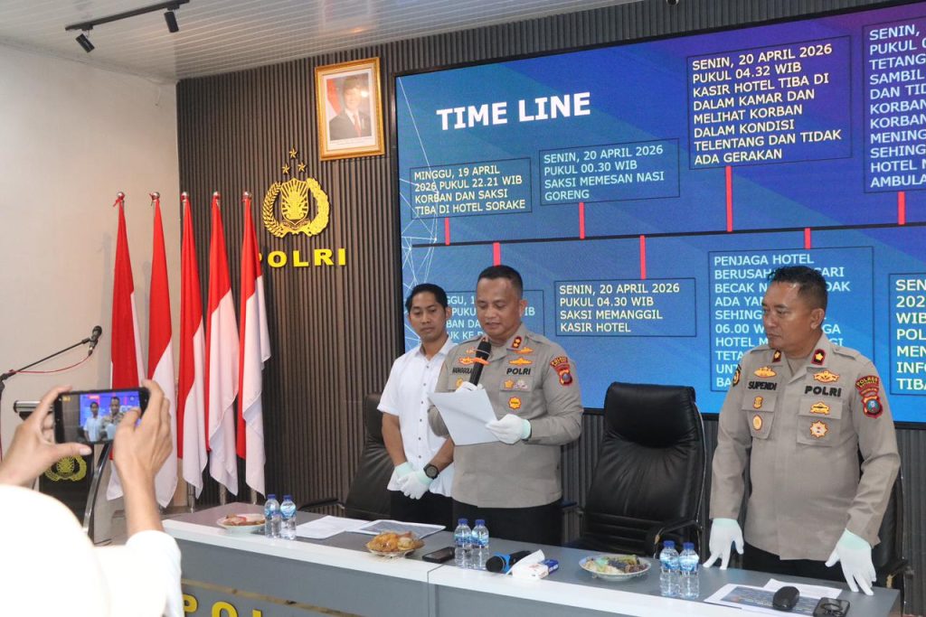 Kapolres Batu Bara AKBP Doly Nelson H.H Nainggolan, S.H., M.H., menggelar press rilis terkait kasus ditemukannya mayat perempuan di Hotel Sorake Desa Perjuangan Kecamatan Sei Balai pada hari Kamis (23/4) sekitar pukul 10.00 WIB. Kasus yang tercatat dalam Laporan Polisi No LP/A/05/IV/2026 tanggal 20 April 2026 ini diduga merupakan tindak pidana pembunuhan atau penganiayaan sebagaimana dimaksud dalam Pasal 459 ayat (1) atau Pasal 466 Kitab Undang-Undang Hukum Pidana (KUHP).
