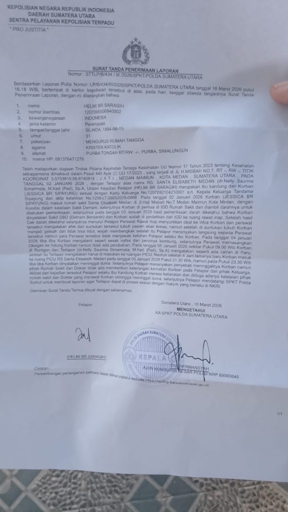 Laporan ini dilayangkan menyusul meninggalnya Jesica Sipayung, balita berusia 2,5 tahun, di RS Santa Elisabeth Medan dalam kondisi yang dinilai tidak wajar.