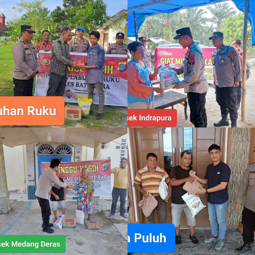 Kegiatan serupa juga berlangsung di wilayah Polsek Lima Puluh. Kapolsek AKP Salomo Sagala, SH, bersama personel menyerahkan bantuan sembako kepada warga kurang mampu di lingkungan Gereja HKBP Lima Puluh Kota. Momentum hari Minggu dimanfaatkan untuk berbagi kasih, menegaskan komitmen Polri dalam merangkul seluruh lapisan masyarakat tanpa memandang latar belakang.